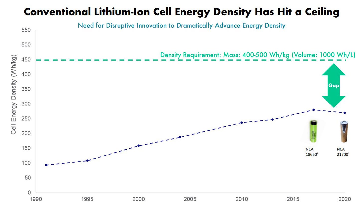 Lithium-ion cells are only making marginal improvements, and 400 Wh/kg energy density is needed to enable long-range, high-performance EVs that will open the addressable market of customers much broader.