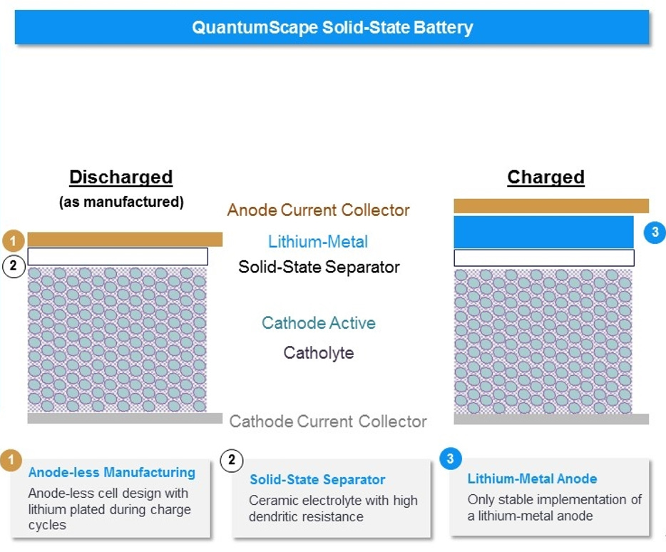 “The QuantumScape separator material is a ceramic capable of meeting the key requirements of high conductivity, stability to lithium metal, resistance to dendrite formation, and low interfacial impedance. These are the key requirements to make a lithium-metal anode, which in turn enables high energy density, fast charge, and long life.”